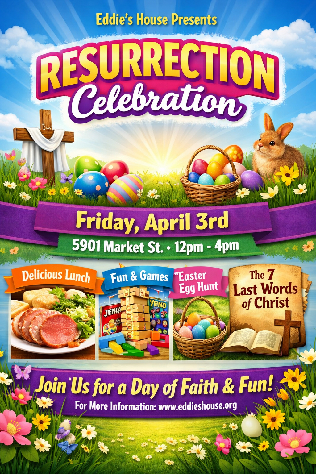 The Resurrection Celebration is a community event hosted by Eddie’s House that blends faith and family fun. It features a delicious lunch, games, and an Easter egg hunt, alongside a reflective service on the “7 Last Words of Christ” to celebrate the season together.